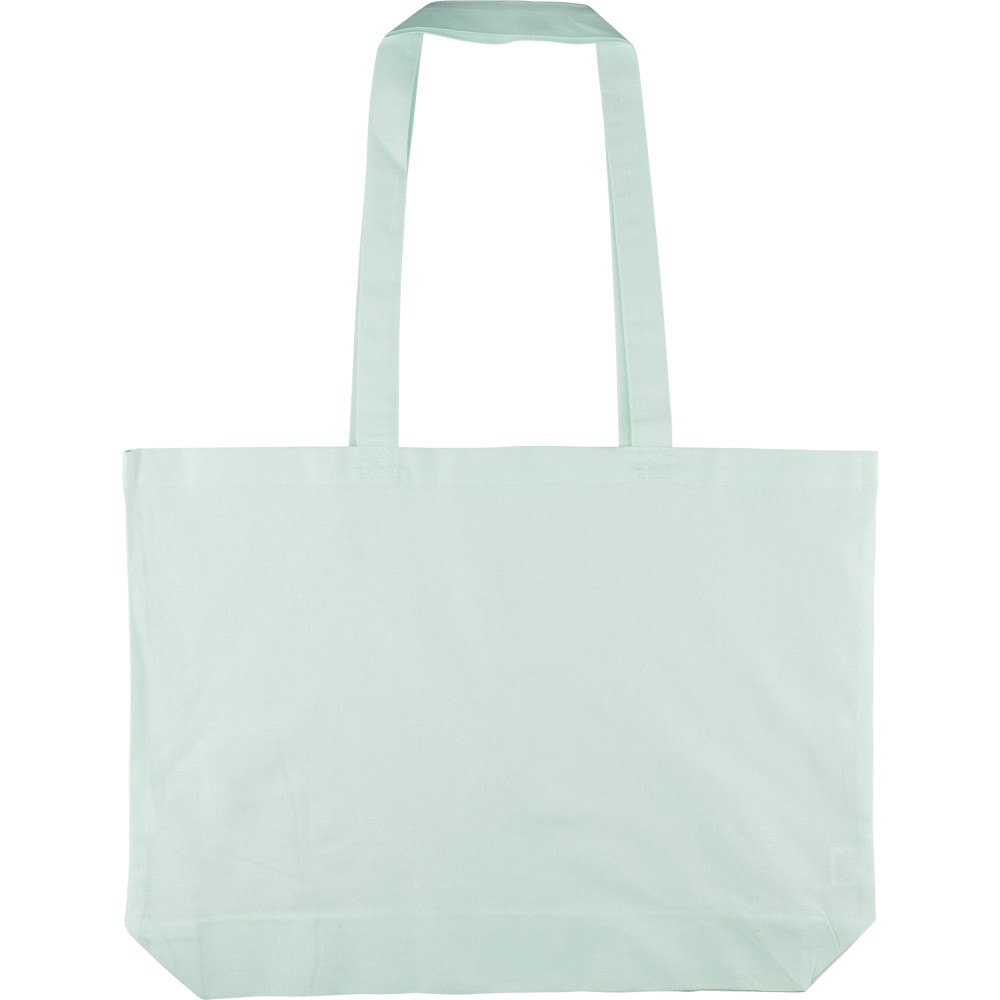 Oeko-Tex minősítésű, 140 g/m2 pamutból készült bevásárlótáska 10 cm-es talppal és 70 cm hosszúságú, 2,5 cm szélességű hosszú fülekkel. Pasztell színekben elérhető: PMS 9562U (zöld), 162U (narancs), 317U (kék) és 522U (lila). Oeko-Tex címkével ellátva.