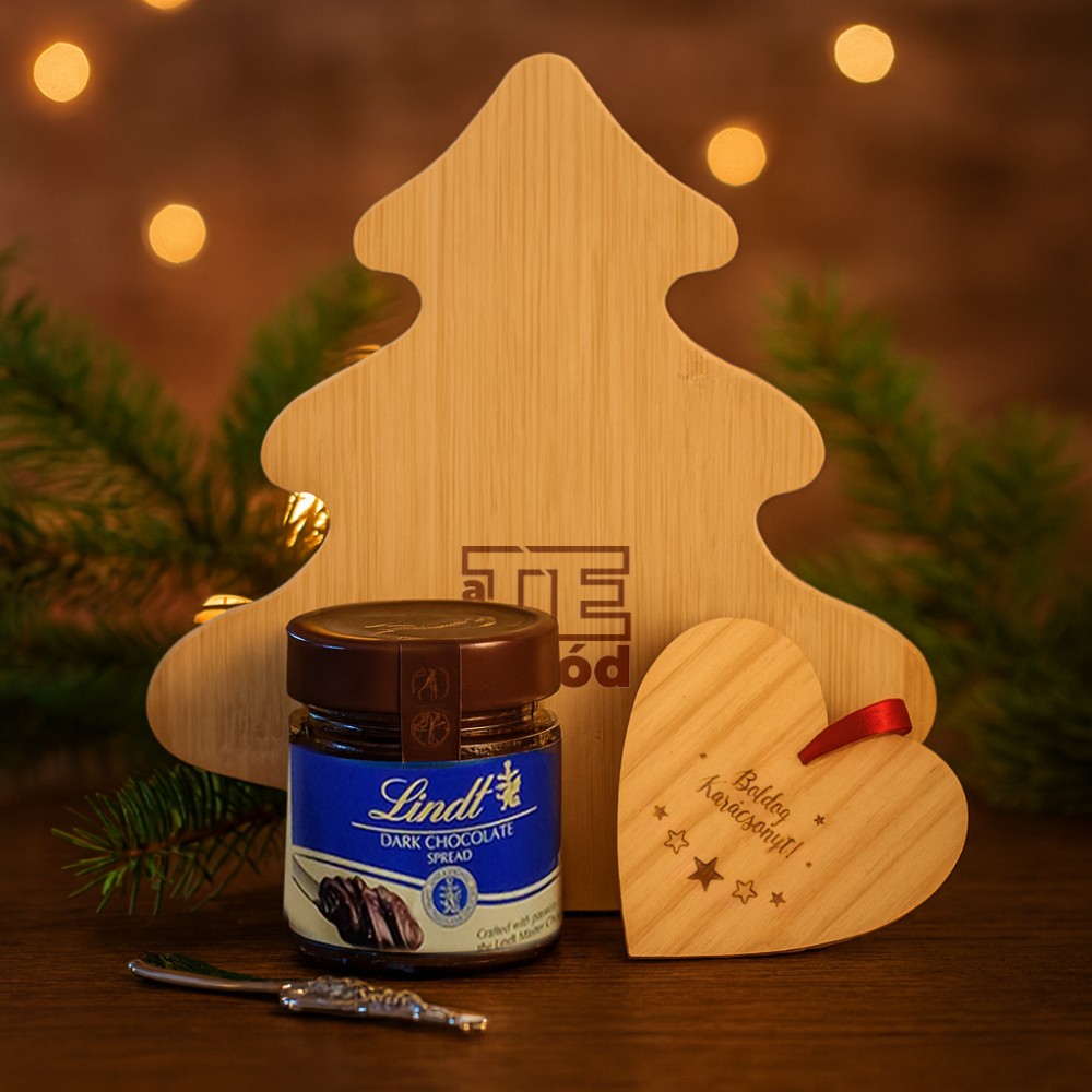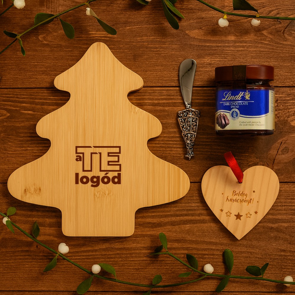 Ünnepi ajándékcsomag, amely gondosan válogatott kiegészítőkkel és finomságokkal teszi emlékezetessé a karácsonyt. A csomag tartalma: karácsonyfa alakú vágódeszka fenyő alakú kenőkéssel (CX1477-40), Lindt dark chocolate krém, 200 g (G20458), szív alakú karácsonyfadísz (9050-11). Csomagolási lehetőségekről érdeklődj ügyfélmenedzserednél! A kép illusztráció. A kínálatunkban szereplő termékek igény szerint kombinálhatók. A csomagot rendelés esetén állítjuk össze. Várható szállítási határidő: kb. 2 hét. A termékek emblémázását és csomagolását nem tartalmazza a csomag ára. A csomagban szereplő élelmiszer csak csomag részeként rendelhető. Csomagoló anyagok