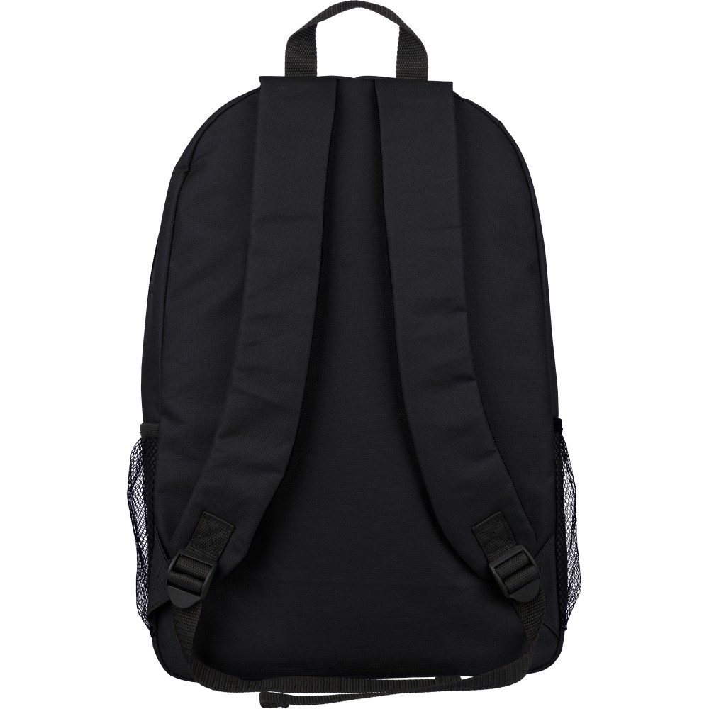 RPET poliészter 600D anyagból készült hátizsák húzózsinóros záródással és nagy cipzáras fő rekesszel. Hálós oldalzsebekkel, rugalmas elülső pántokkal, dekorációhoz kialakított kis elülső cipzáras zsebbel és állítható vállpántokkal rendelkezik. A terméken rPET alapanyagra utaló címke található.