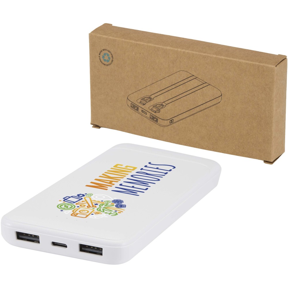 Adhil 10.000 mAh powerbank: Az Adhil 10.000 mAh-s powerbank újrahasznosított műanyagból készül, kompakt kialakítása egyszerre stílusos és praktikus. Két beépített kábellel rendelkezik: egy Type-C, valamint egy Lightning/microUSB kombinált csatlakozóval, továbbá két USB-A kimenettel és egy Type-C bemenet/kimenettel, így sokoldalú töltési lehetőségeket kínál. Az LED-jelző mutatja a töltési állapotot, így útközben is megbízható energiaforrás.